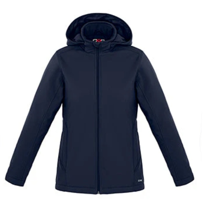 300 gsm – 8.9 oz./yd2 – 15 oz./lin. yd 100% polyester mechanical stretch softshell bonded with micro fleece 8000 mm waterproof rating, 800 gsm breathability rating, wind resistant and water repellent finish. Insulation: 100 gsm body, 80 gsm sleeves 100% recycled polyester. YKK reverse contrast color coil front zipper closure. Outer pockets with YKK zipper closure. Removeable hood with adjustable draw cord. Drop tail hem with adjustable draw cord. Inner fleece sleeve storm cuff with outer adjustable hook and loop tab closure on cuffs. 2 inner pockets with hook and loop closure. CX2 tonal printed logo taffeta lining.